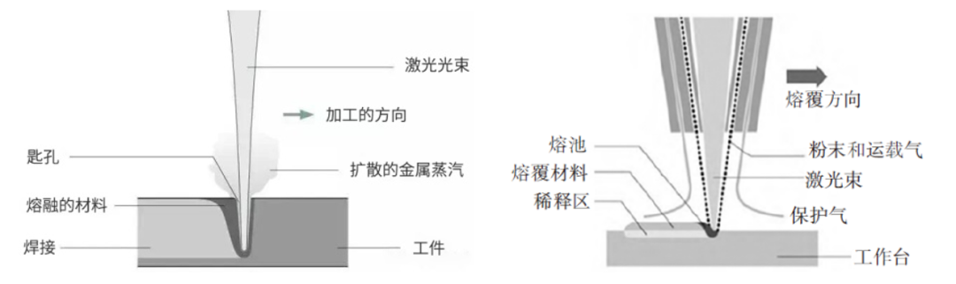 激光焊接(左)與激光熔覆(右)原理示意圖